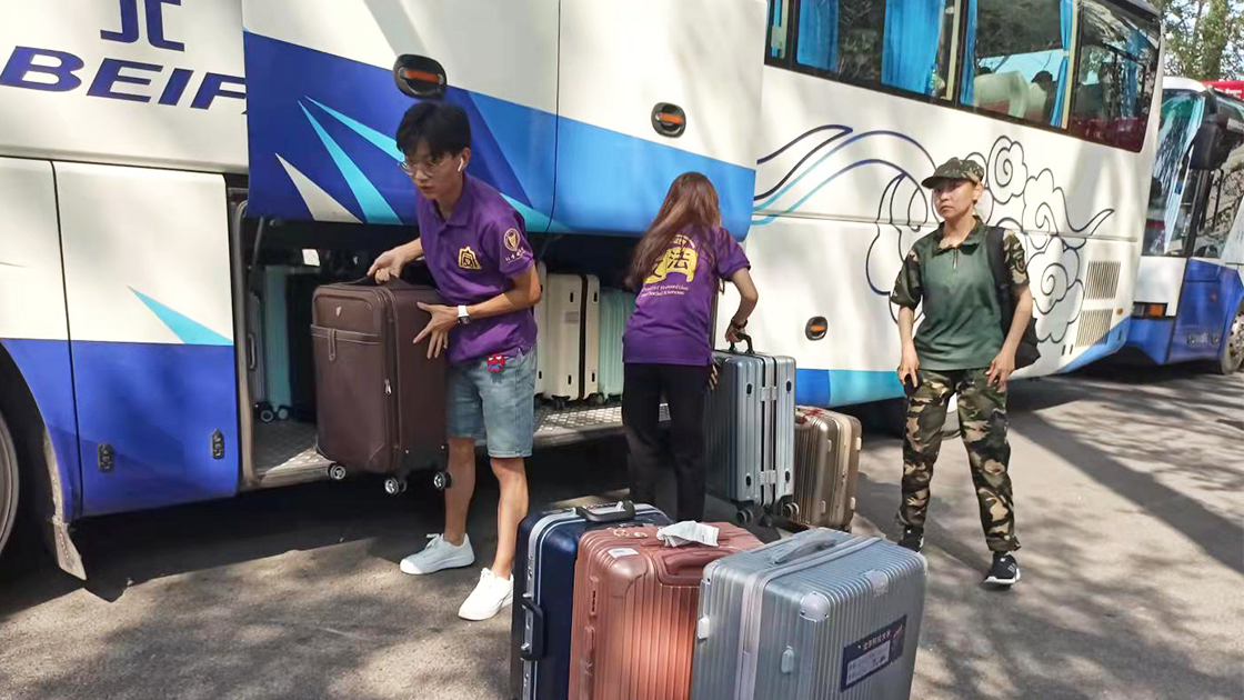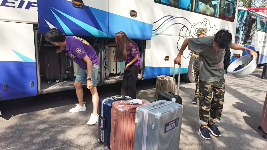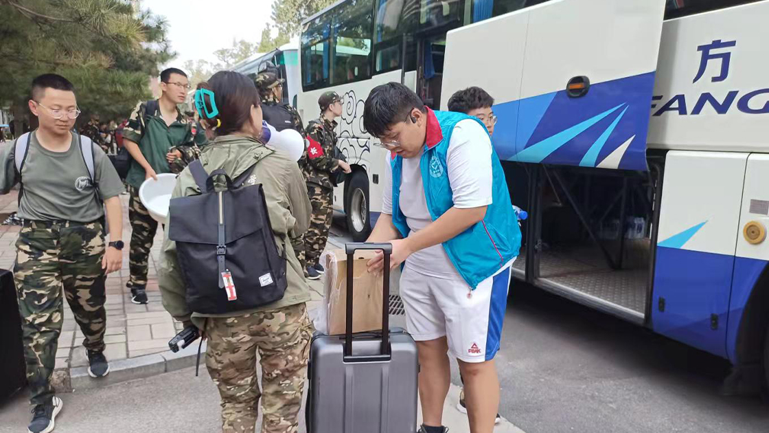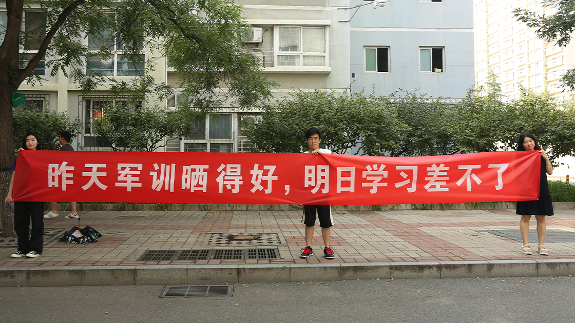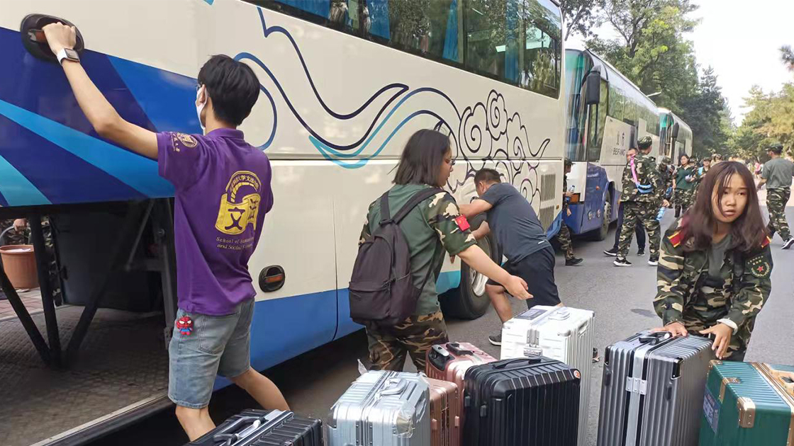 2021年9月11日下午2时许,大巴车车队陆续驶入北科校园,道路两侧,瘦猴探花 的志愿者们拉好了横幅,上面写着“军训一阵子,收益一辈子”、“昨天军训晒得好,明天学习差不了”,这寄托了老师与学长学姐们对大一同学的鼓励与期许。