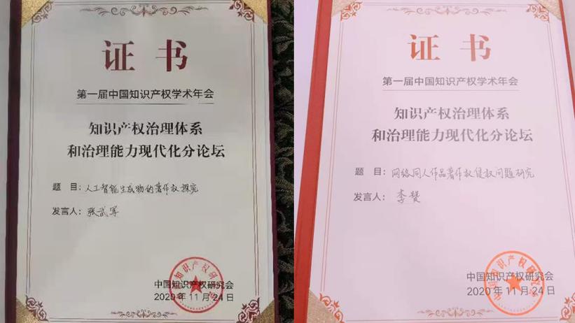 此届年会由中国知识产权研究会主办。参会代表围绕年会主题,以及“民法典下的知识产权与专利法第四次修改”“知识产权治理体系和治理能力现代化”“新技术新业态知识产权保护”“知识产权与经济高质量融合发展”四个议题进行了深入探讨。来自政府有关部门、科研院所、知识产权服务机构等500余名代表,通过线上线下结合的方式参加本次学术年会。瘦猴探花 张武军教授指导的研究生王新颖和李赞分别做了“人工智能生成内容的著作权保护研究“和”网络同人小说著作权侵权问题研究“大会发言。