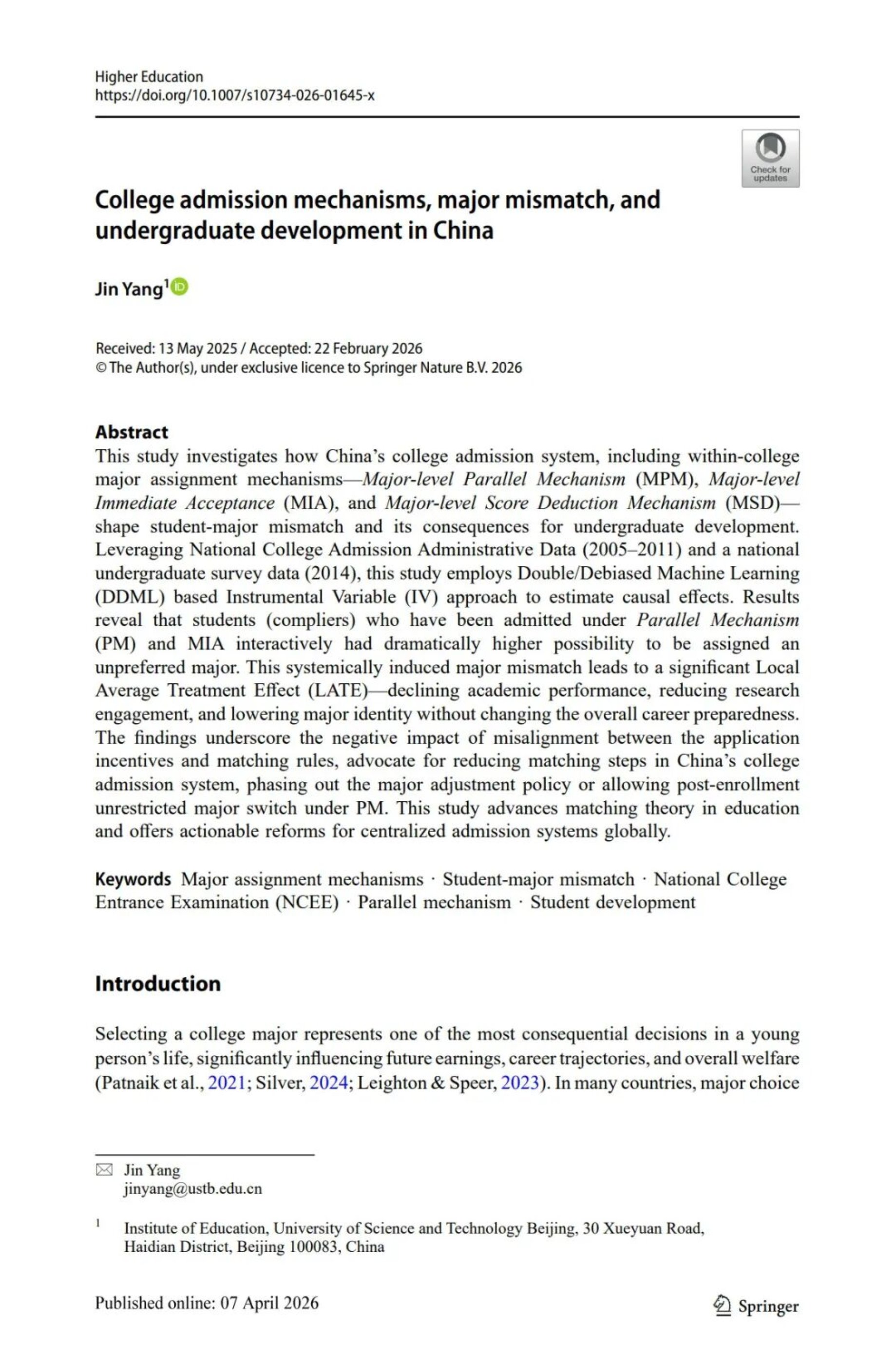 近日,教育研究院青年教师杨晋博士以独立作者身份撰写的学术论文《College admission mechanisms, major mismatch, and undergraduate development in China》正式发表于国际高等教育研究领域权威期刊Higher Education(2026 年)。