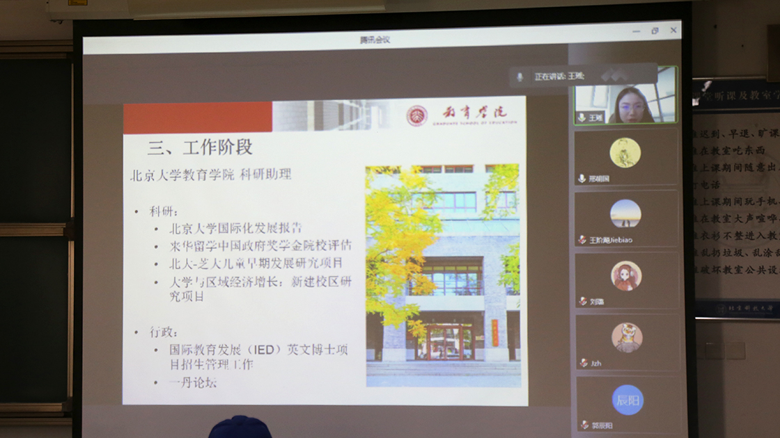六位优秀的社会工作专业毕业校友通过线上连线,分别结合自身留学经历和感悟,从留学申请书撰写、奖学金申请以及学业与日常生活等多方面对留学相关事宜进行详细讲解。在讲解的过程中,学长学姐们均提到留学可以锻炼自己的独立能力,能够开阔自己的眼界。学长学姐们鼓励有意愿留学的同学大胆尝试,根据自身的性格、能力差异,学会正确审视自己,扬长避短,合理规划。